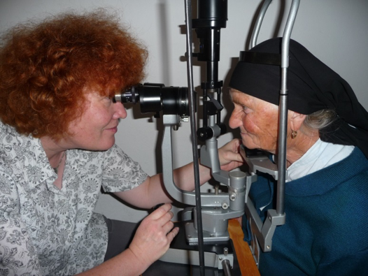 Die Untersuchungen, die dieses Mal auch auf Erwachsene ausgeweitet wurden, weil ich als Augenärztin dabei war, fanden unter einfachsten Bedingungen statt. In Fushe Arrez haben wir einen Raum einrichten können mit ein paar gespendeten Geräten, die unter großem Engagement und mit viel Kreativität aufgebaut und in Gang gebracht wurden. Da die Spaltlampe nicht funktionierte, bauten eine Elektrikerin, die als Schwester im Kloster von Fushe Arrez für die Ärmsten der Armen da ist und ein Elektriker aus der Region innerhalb von einer Stunde eine Kupferdrahtspule, die als Trafo auf den Widerstand der Glühlampe der Spaltlampe abgestimmt war. Das Fenster wurde kurzerhand mit einer Decke und zwei Pappen verdunkelt, die einzige wackelige Steckdose des Raumes erhielt zahllose Verlängerungskabel und Dreierstecker, um die verschiedenen Geräte nutzen zu können (natürlich nicht gleichzeitig). War ein Patient zu klein, nahm Schwester Martina ihn für die Untersuchung auf den Schoß. Die Patientenschlangen auf dem Weg zu unseren Untersuchungsräumlichkeiten rissen nicht ab und innerhalb von zwei Tagen hatten wir 600 Augen untersucht. Sogar aus entfernten Bergdörfern machten sich Patienten auf den Weg.