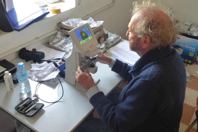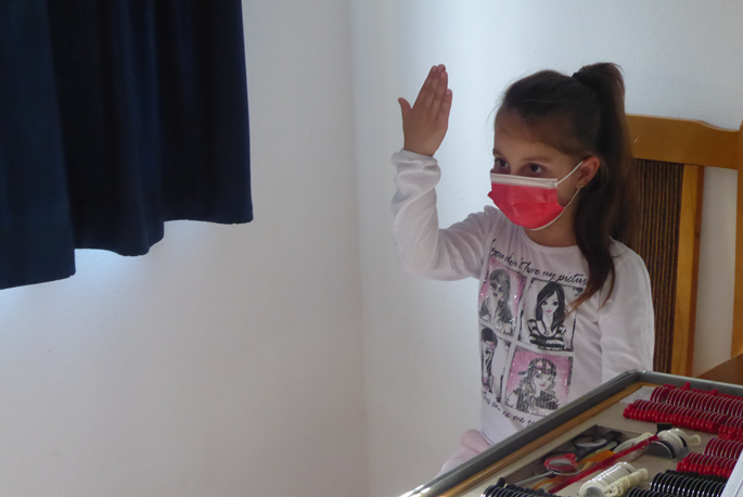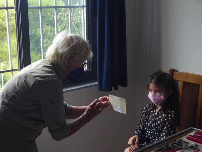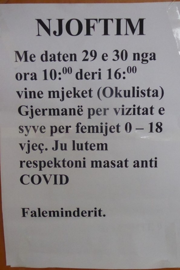 In unseren Stationen in Zejmen, Fushe-Arrez und Bajram Curri waren die meisten Geräte noch einsatzbereit. In Bajram Curri hat der Visusprojektor nicht funktioniert. Improvisieren sind wir gewohnt, zur Sicherheit hatten wir eine neue E-Haken-Tafel mitgenommen. In Fushe-Arrez konnten wir einen neuen Scheitelbrechwertmesser zum Ausmessen der Brillen in Betrieb nehmen, den uns das Deutsche Komitee zur Verhütung von Blindheit zur Verfügung gestellt hat. Im Fluggepäck hatten wir einige Hundert Masken; Dritan hatte ein großes Sortiment an Desinfektionsmittel nach Albanien gebracht. Auch in den Aushängen war auf die besondere Pandemie-Situation hingewiesen worden. Es war aber nicht immer leicht, die Kinder und Eltern dazu zu bringen, die Masken nicht nur über den Mund, sondern auch die Nase zu ziehen. Erfreulich war, dass wir eine Reihe von gebrauchten Brillen vermitteln und dadurch eine sofortige Hilfe bewirken konnten. Zum Beispiel konnte vier Jugendlichen mit Myopie (Nahsichtigkeit), die in der Ferne nur 20 % sahen und noch keine Brille hatten, unmittelbar im Untersuchungsraum geholfen werden. Jetzt müssen sie in der Schule nicht mehr in der ersten Reihe sitzen, um mit zusammengekniffenen Augen die Konturen des Tafelaufschriebs erahnen zu können. Insgesamt haben wir in den zehn Tagen unseres Einsatzes etwa 400 Patienten untersucht.